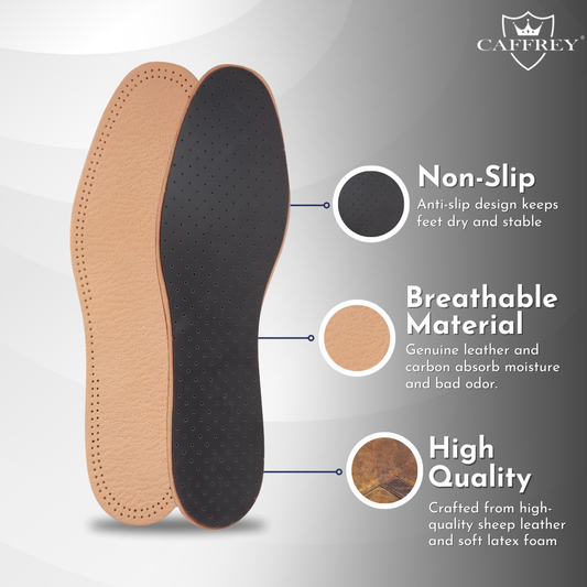 Caffrey Eleganza Natural Sheep Leather Insoles - Soft Latex Foam Cushioning - Shoe Odor Eliminator - Slip Prevention - Ideal for Men & Women's Closed Shoes - Durable, Moisture Absorbing