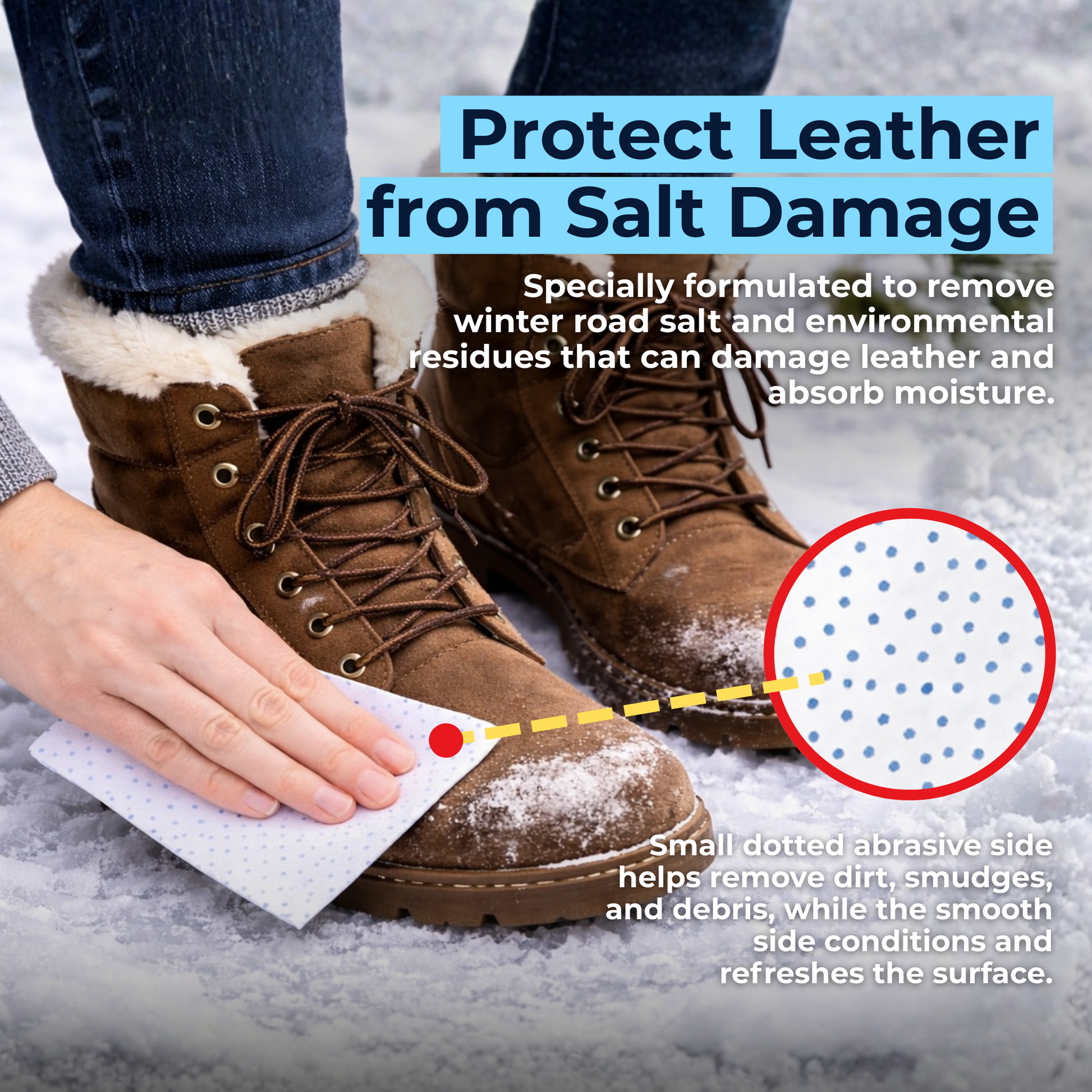 Winter roads in Canada are treated with salt, which absorbs moisture and gradually damages leather. Essential Wipes clean and protect in one step, keeping shoes fresh, healthy, and vibrant.