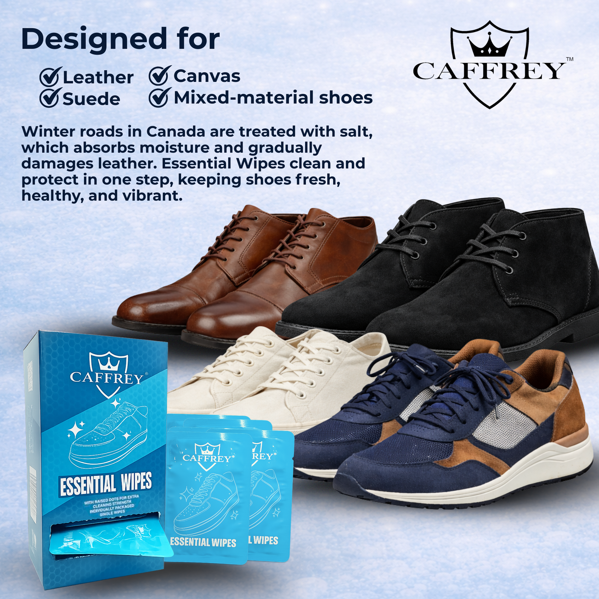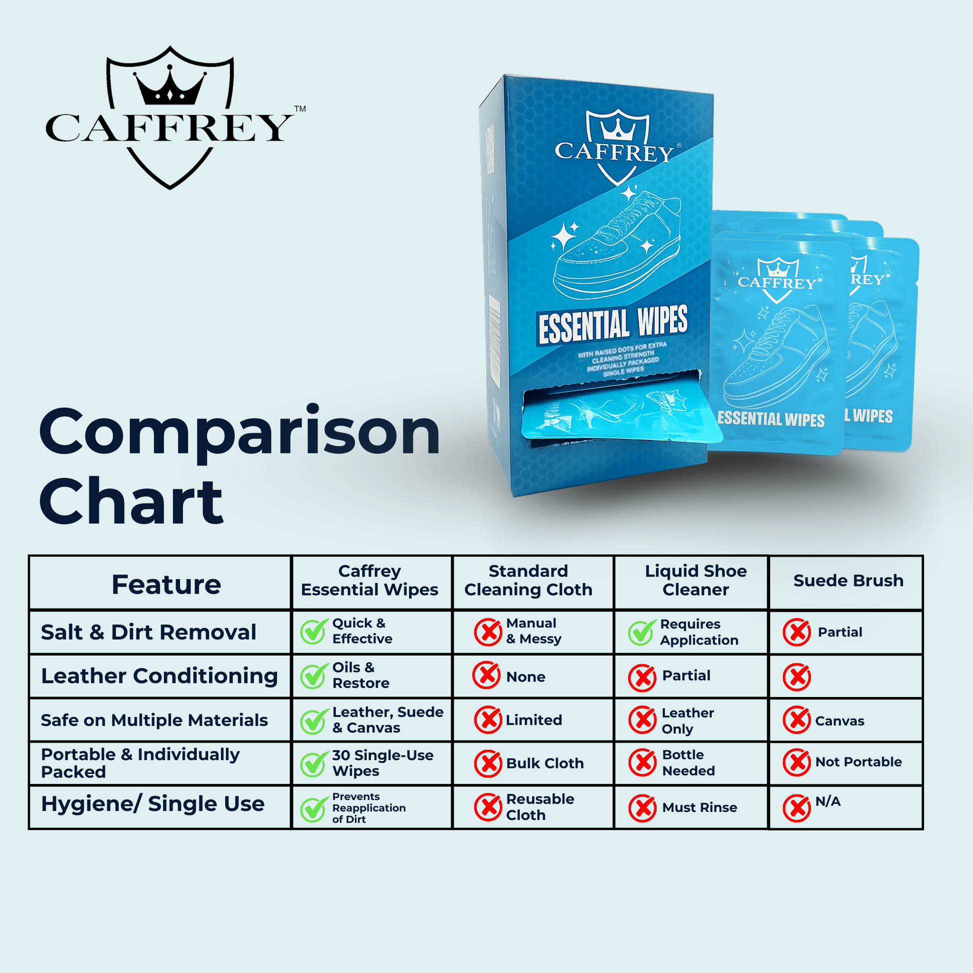 With Caffrey Essential Wipes, shoes stay clean, protected, and looking their best, no matter the weather or environment.
