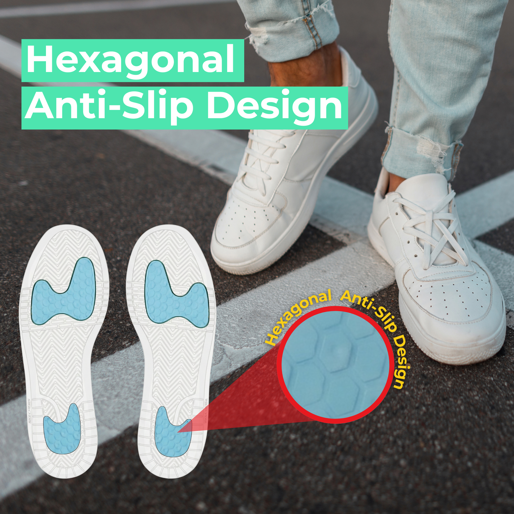• HEXAGONAL ANTI-SLIP DESIGN – Exagonal striation prevents movement inside the shoe.